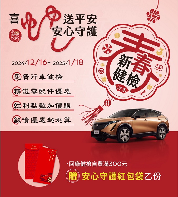 歲末時節將至,NISSAN與您一起預備迎接新年的到來,特別推出NISSAN 2025「喜蛇送平安,安心守護」春節健檢活動,提供多項行車安全檢查、精美新春回廠好禮、烤漆優惠及新春限量紅利點數加價購等多項優惠,活動期間自2024年12月16日起至2025年1月18日止,於全台NISSAN服務廠同步開跑,NISSAN貼心邀請車主回廠進行愛車健檢,共同守護家人出遊平安,安心迎接新春旅程。