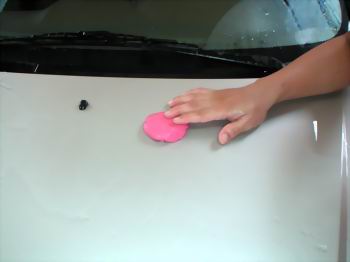 ▲把魔術黏土捏平,別忘了讓漆面保持濕潤,不然會刮漆喔!90年代某日商汽車美容公司進駐台灣,順便將它們所生產的魔術黏土帶來台灣推廣至旗下的美容連鎖店,這便是台灣魔術黏土的濫觴。自從有了魔術黏土之後,去除車漆上非柏油類的污染物質變得省時與輕鬆容易,同時也具有較不研磨車漆的優點,從此不再仰賴粗臘以一次又一次的研磨車漆的方式來清潔車身了。