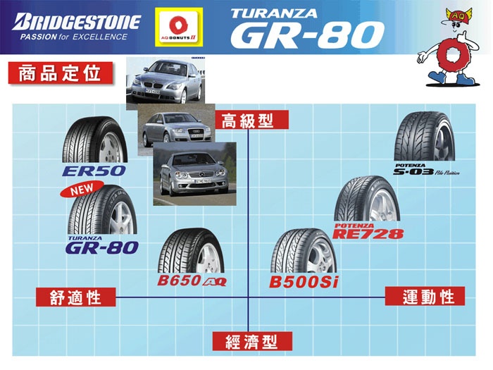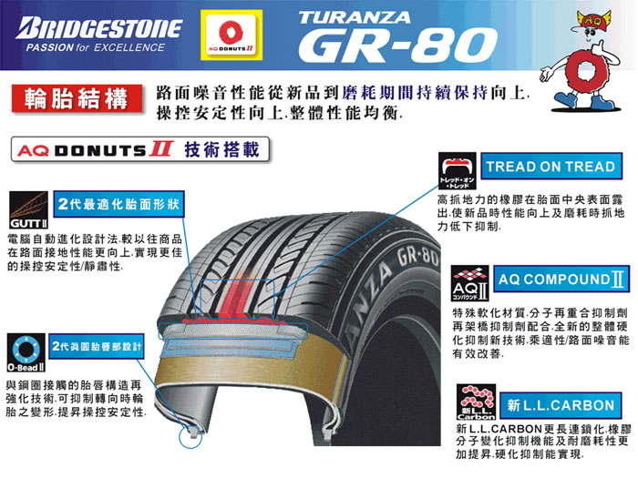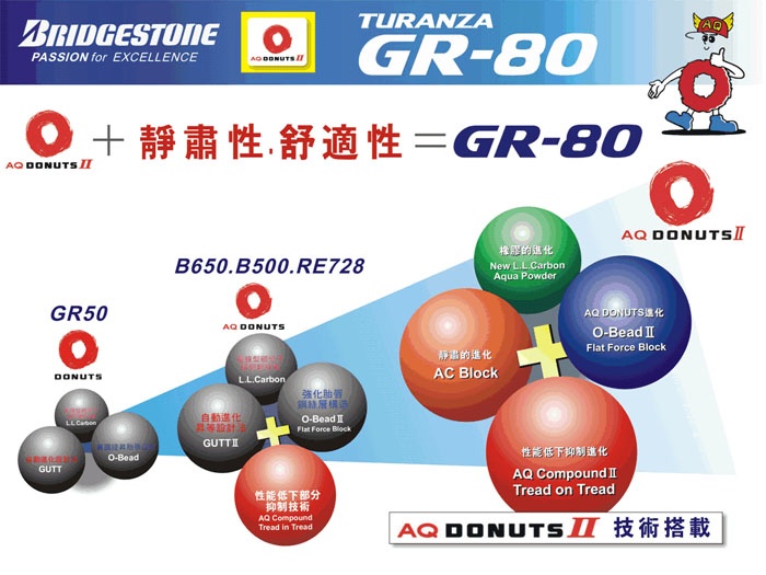 TURANZA GR-80是普利司通第一款採用AQ DONUTS II技術的高級胎,商品定位在舒適、高級型,僅次於ER-50系列。特色是從新品到磨耗時,都能夠維持一定的靜肅性與性能。從GR-50第一代DONUTS技術起,便致力於長鏈碳分子L.L.Carbon、GUTT自動進化設計、O-Bead真圓提升胎唇設計等方向努力。B650、B500、RE728系列加入了AQ理念,使用了AQ Compound Tread in Tread技術,提升產品的性能持久性。GR-80進化為AQ DONUTS II,增加了AC Block靜肅性胎塊設計、New L.L. Carbon Aqua Powder橡膠進化,加上AQ DONUTS O-Bead II Flat Force Block強化胎唇鋼絲層構造,以及AQ Compound II Tread on Tread更優異的性能低下抑制進化設計,加上五段式GUTT II配列,不但可有效降低花紋噪音,運動性能的提升與耐久性都獲得驚人的成效。