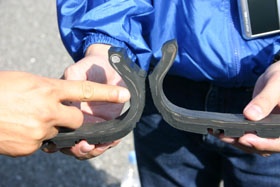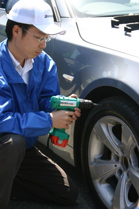 ▲RFT測試之前,先把風嘴完全卸除,而且在胎壁鑽孔,表示輪胎確實是在完全洩氣的狀態下進行測試。 |