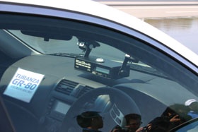 ACCORD測試車上的儀器,看起來是G值感應的裝置,注意其吸附玻璃的吸盤以及上方的水平校正,都比國內雜誌測試用的儀器更為講究。 |