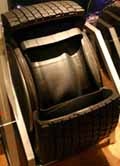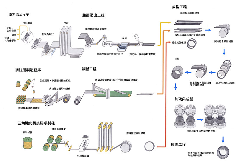 輪胎的生產流程其實相當複雜,從原料開始到成品,一連貫的流程都在自動化的設備中嚴謹而精確地完成。輪胎在生產過程中,必須先分別製造胎面、鋼絲層以及胎壁三角強化鋼絲環,再以人工在滾輪治具上將三者組合成為生胎,最後送進加硫機,像蒸糕餅一樣控制時間溫度,把胎紋印上去,完成後經過冷卻,再進行去胎毛以及檢查工程,看似容易,其實從原料開始,每個步驟都經過嚴格的品管與精密地電腦流程控制,例如胎面裁切,長度與重量都得符合標準,否則將淘汰回收再次熔製,在流程中嚴密控制,製成新胎時的不良率自然獲得有效控制。 |