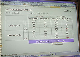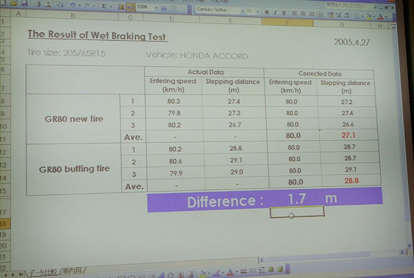 結果:GR-80新品的煞車平均距離為27.1公尺,50%打磨劣化品煞車平均距離為28.8公尺,兩者相差僅1.7公尺。由於測試車皆已將ABS煞車防鎖死系統取消,因此完全倚賴輪胎本身的摩擦力停止車輛前進,在50%打磨的情況下,距離才增加1.7公尺,算是相當優秀的成績。