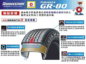 ▲TURAZNA GR-80是普利司通最新科技的結晶,不但舒適,操控性能也非常優異,價格大約比同等級輪胎高20%左右,各方面表現卻高出甚多,相當值得。 |
