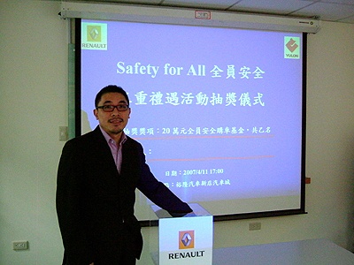 為宣導汽車 「Safety for All 全員安全」理念,RENAULT 總代理裕隆汽車於 2007/1/5 ~ 2007/3/31 舉辦「Safety for All 全員安全」三重禮遇活動,共有超過 3,500 位消費者參加問卷活動,活動業已圓滿結束。