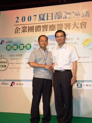 ▲經濟部長陳瑞隆(右)與中華汽車吳煒地廠長攜手為夏日節能努力中華汽車早在1999年即成立「節約能源推動小組」,以實際作法逐年落實省能目標。電能方面,除了室溫超過28°C才開啟冷氣之外,目前中央空調每運轉50分鐘即降載10分鐘自動節電;照明設備也全面更新為電子省電型日光燈及省電水銀燈,配合責任制的手拉開關,光「隨手關燈」的小動作,一個月就能節省約30%的耗電量。由於汽車製造業的產業特性,中華汽車也e化管理耗電量佔全廠8成的生產用電,透過製程簡化、能源再生整合、設備效率提升等作法,達到耗能最低、效率最高的目標,今年4月的生產用電比起3年前同期就降低了26.1%。此外,中華汽車廠內數千台電腦、影印機、飲水機等事務用品,也由公司統一設定自動斷電時間,因為一台電腦持續開機一整晚,消耗的能源可列印10,000張資料,所以中華汽車也採納同仁改善提案的建議,採取源頭控管方式,從’04年至’07年3月,節省金額已超過3,600萬元。