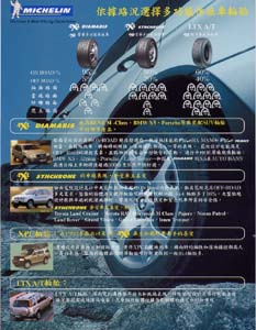 當然,在這SUV當道的年代,MICHELIN當然不會忽略SUV車主的存在,從1996年到2001年,MICHELIN的輕卡車和SUV輪胎年年獲得美國J.D.Power and Associates Award最佳換胎選擇滿意獎,在與LAND ROVER與BMW共同開發出的全新 4×4 DIAMARIS和 4×4 SYNCHRONE輪胎,在柏油地的表現直追Pilot PRIMACY,讓SUV車主在越野之餘,也能保有平日的舒適性。