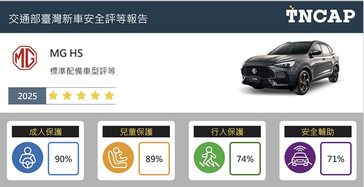 國產中型運動休旅車MG HS於四大安全領域得分率中分別獲得成人保護 90%、兒童保護 89%、行人保護 74%及安全輔助 71 %,整體星級評等為五顆星。