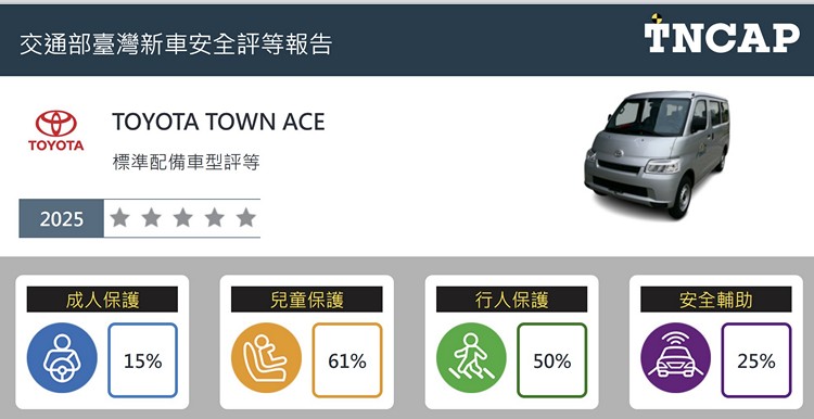 輕商車Town Ace首次登場「零顆星」掛蛋而歸! 2025年TNCAP第三季車款評等結果出爐