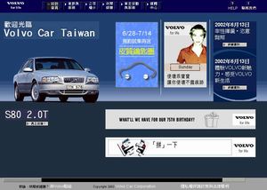 ![]() Volvo活動網站為消費者帶來另一種不同的汽車網站經驗,消費者可享有從網路上直接預約試車;未來亦會透過網路自成一獨立銷售通路,成為特殊車款的唯一銷售管道;線上客戶在網路虛擬環境中的各種特殊服務,也在積極籌劃中,Volvo將陸續對客戶發表各項嶄新的優質服務;當然,不可或缺的最新線上或實體活動消息,也將透過活動網頁向外界發佈,以進一步推展良好的顧客關係。