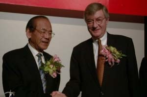 ![]() ▲永業集團總裁唐誠先生與法方CITROEN亞太銷售經理Brillat,於遠企中心進行簽約儀式。永業集團在放棄VW品牌代理權不久後,便開始與法國的CITROEN進行代理權的合作事宜,而法方對於永業長期在台灣地區建立的完整經銷體系相當有信心,亦促成這次的雙方合作案。而永業集團加入了CITROEN之後,聯合BENTLEY、ROLLS ROYCE、PORSCHE、BMW、AUDI等知名汽車品牌,總共旗下擁有六個汽車品牌之多,遍及的汽車生產國有英國、德國和法國,成為國內少數的大型汽車代理商。