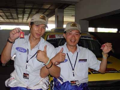 ![]() ▲8/6出發前手持大甲媽護身符乞求平安2005 「亞洲越野拉力賽」第二、三天的賽程先從Ayutthaya出發到 Mae Sot,再由Mae Sot出發至Mae Hong Son泰緬邊境的他念他翁山脈進行,兩天賽道總長共1,166.9公里。7日當天跑了兩個SS路段,皆是以競速橫跨狹窄樹叢、凹凸崎嶇的艱困山區地形;8日,泰國突然下起大雨,還發生第一賽段工程車險些掉落山崖的驚險情況,使得大會臨時取消第二個賽段,傍晚,由陳和皇及顏行書代表的福特Escape車隊9號車,在回程中臨時又遇到電瓶沒電的突發狀況,導致車子停擱在半山腰,臨時請求維修小組調度電瓶,讓所有問題迎刃而解,倆人也順利返抵下榻旅館。