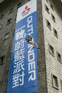 ![]() ▲OUTLANDER車主參加七層樓高空垂降體驗在這場別開生面的活動中,首度規劃了七層樓高空垂降的體驗課程,在挑戰膽識之餘,參加者居高臨下,將北海岸的山海美景盡收眼底。此外,本次活動適逢一年一度的國際風箏節,中華三菱除特別製作Outlander紀念風箏致贈參加者外,並邀請風箏專業人士現場示範特技風箏的操作,現場並施放一個特製的超大型三菱立體風箏,將金山沙灘的天空點綴得極為繽紛壯麗。