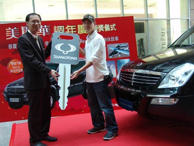 SsangYong雙龍汽車日前贊助美麗華百樂園週年慶,抽獎活動已於11月26日圓滿結束,超級夢幻大獎「SsangYong Rexton 270 FSUV」家庭號柴油休旅旗艦,由台北的超級幸運兒-廖世傑先生獲得,廖先生表示,長久以來,久聞Ssangyong雙龍汽車為國內柴油休旅第一品牌,對Rexton 270 FSUV強大的動力輸出及豪華的內裝更是頃心已久,沒想到竟然可以成為這台心目中百萬夢幻休旅的車主,直到接到鑰匙的那一霎那,還不敢相信是真的呢!