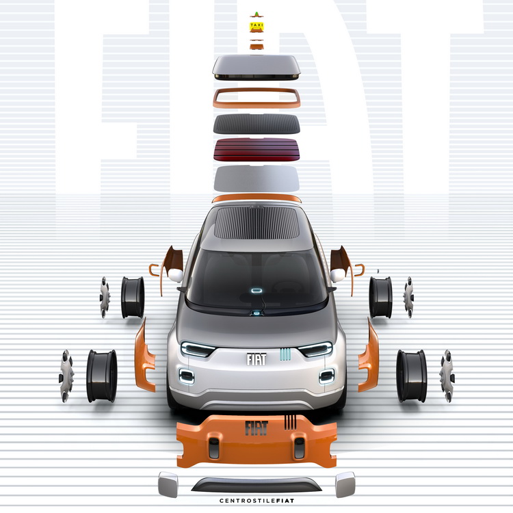 ![]() 這部概念車也是FIAT對於小型電動車的提案,造型設計靈感源自於1980年代的Panda。車身尺碼為車長:3680mm、車寬:1470mm、車高:1527mm,軸距:2430mm。高度的外觀變化自由度是它的一大特點,FIAT表示,如同白紙一張的Concept Centoventi透過所謂4U Program客製改裝,可以任意從四種車頂、四種保險桿、四種輪圈護蓋與四種鈑件外殼中任意拆裝變換組合。也可選擇敞篷或太陽能電池車頂。太陽能電池所產生的電力可以用於停車狀態下開啟空調或是在車尾顯示訊息。
