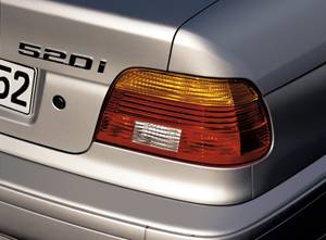 ![]() ▲新5在尾燈組部分改用了發光二極體(LED)取代原本的燈泡結構。除了車頭部分的改變外,小改款後的5系列將原本車身四周的橡膠飾條改為車身同色處理,其中在八缸引擎的車款上還加上額外的鍍鉻飾條,並且在前車門後視鏡三角形基座、B柱與車窗導軌等部分增加霧面金屬表面處理。在尾燈組方面小改款車型仍然維持原車款的燈組造型,但是在配色上卻有些改變,除此之外,新開發的發光二極體(LED)照明取代了原本的燈泡設計,除了光度更均勻、辨識性更佳卻不會造成過度炫目的優點外,發光二極體也具有更長的使用受限。更甚者,因為整個燈組是由多條獨立的發光二極體組合而成,因此也可以避免因為其中一條故障時整個燈組都失去作用的可能,提升安全性。全車系除了柴油動力的520d一款外,全都換用上BMW新設計的鋁圈作為標準配備。