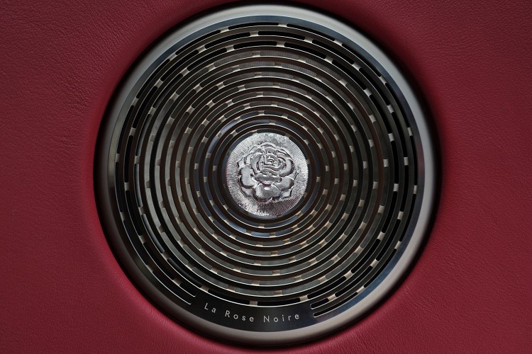 而鐘錶一經取下,儀錶盤上的展示位置就會被一個精緻典雅的鈦金屬鏤空錶殼替代,錶殼上鑲嵌著一枚由愛彼工匠手工雕刻的玫瑰圖案白金硬幣。車內的Bespoke Audio揚聲器罩上雕刻的精妙玫瑰圖案也與這一主題相呼應。每件裝飾作品都在瑞士的品牌工作室中手工精心雕琢而成,這也是車內唯一以寫實風格呈現巴卡拉玫瑰圖案的飾品。