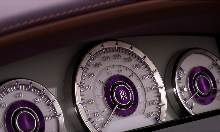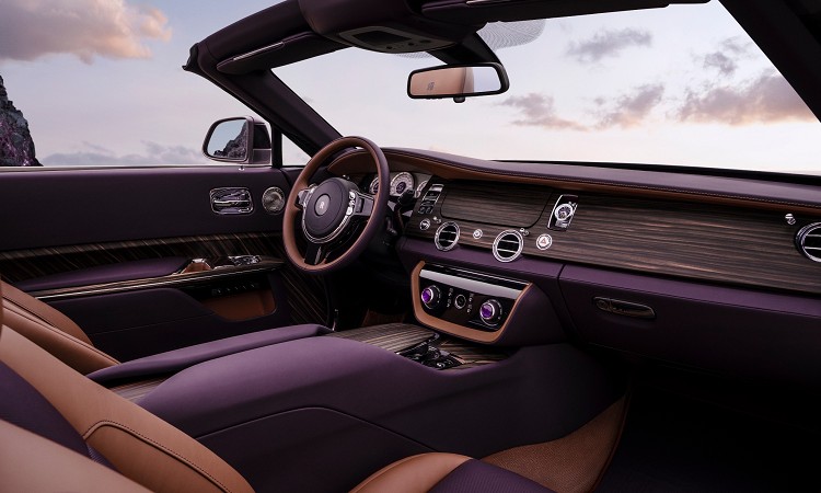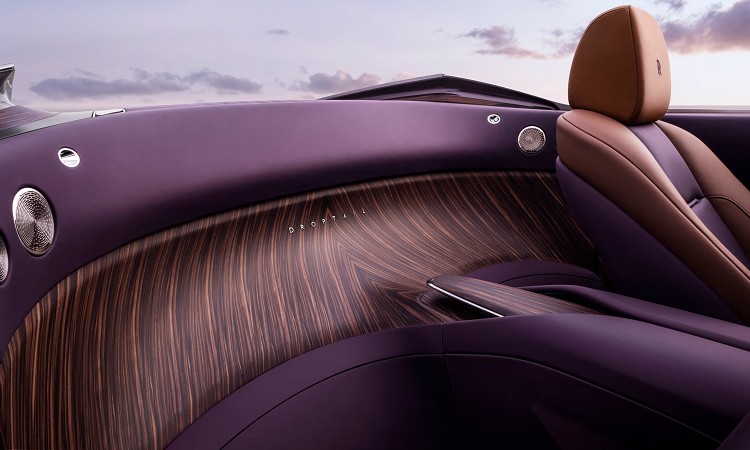 在內裝部份,客戶及其家人親自選定了運用於勞斯萊斯Droptail Amethyst中的材質與工藝。客戶提供的一塊卡拉曼德黑檀木(Calamander Light)樣本擁有繁複有致的紋理與長長的色帶,令人賞心悅目。這一木材樣本的獨特色澤也同時成為了該車皮革加工工藝的靈感來源,一種擁有柔和撞色特徵的真皮色調被恰如其分地命名為沙丘(Sand Dunes),與卡拉曼德黑檀木上的焦糖色紋理相得益彰。確定材質之後,勞斯萊斯木材專家們則需面臨一項極具挑戰性的任務—尋找色彩與皮革色調完全一致的木材。最終,歷時六個多月的時間,審閱了逾百根原木,木材專家找到了最為完美的材質。勞斯萊斯為Droptail Amethyst創造了歷史上應用區域最為廣泛的木質飾面,木質飾面從儀錶延展到車門及弧形飾板區域,並綿延至懸臂式基座中央扶手及車尾甲板。