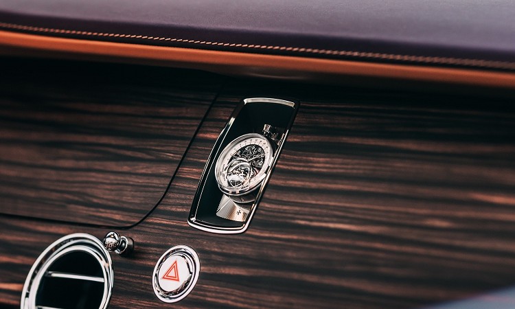 勞斯萊斯 Droptail Amethyst 中控區域還鑲嵌著一枚由客戶委託著名瑞士奢華鐘錶品牌江詩丹頓 (Vacheron Constantin) 定制的鐘錶。這款名為 Les Cabinotiers渾天儀式陀飛輪時計鐘錶於日內瓦手工製作,搭載工藝精密繁複的手動上鏈複雜功能機芯。鐘錶被安置於一個特別設計的可拆卸一體式支架系統中,如有需要,可將其取出單獨存放。