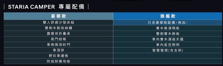 STARIA CAMPER靈活多元應用 化身行動小豪宅 同步登場的STARIA CAMPER,以靈活彈性的車廂空間,搭載完整的車宿設備,化身「行動小豪宅」。無論是長途旅行或週末露營,皆能帶來舒適、便利又安全的旅宿體驗,滿足消費者對戶外生活的全方位需求。全新STARIA VAN與STARIA CAMPER即日起將於HYUNDAI汽車全台商用車展示中心展出並開始接單,誠摯邀請消費者蒞臨體驗,感受STARIA車系所帶來的嶄新移動價值。