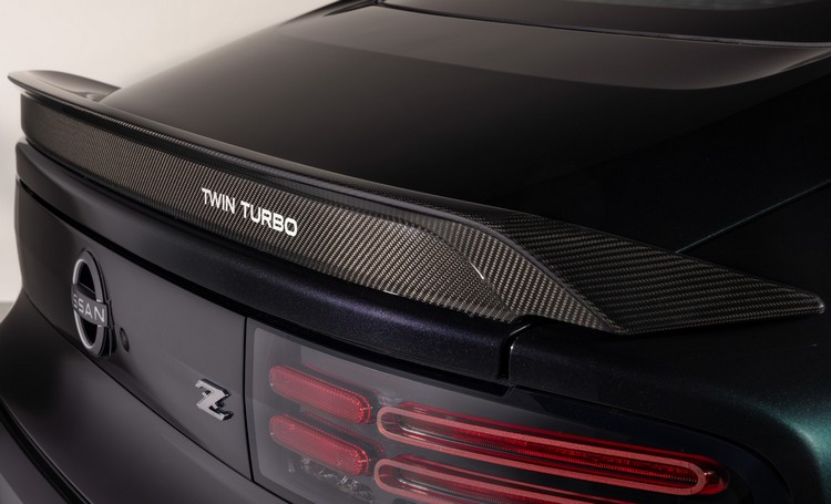 NISSAN 為這部特式車增添了青銅色19 吋RAYS 輪圈、帶有復古風格「Twin Turbo」銘牌的碳纖維後擾流翼以及其他青銅色點綴,這些設計靈感皆來自300ZX。它還配備了青銅色「Twin Turbo」車側圖案,散發著復古風格。
