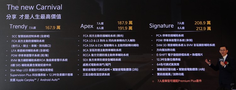 ![]() ▲Kia亞太區總裁暨執行長Ki Seok Ahn率團現身Kia Carnival新年式八人座上市活動現場,新車售價分別為:Apex八人座191.9萬、Signature八人座212.9萬。Kia Carnival自問世以來,屢屢在國內外車壇掀起熱烈迴響,不僅蟬聯四屆車訊風雲獎「最佳進口大型MPV」,更在今年1-8月累計銷售近1,500台、較去年同期成長達53%的驚人成長力道,穩坐同級進口大型MPV冠軍;自上市以來截至8月底,Carnival已累積銷售5,172輛,暢銷程度可見一斑。