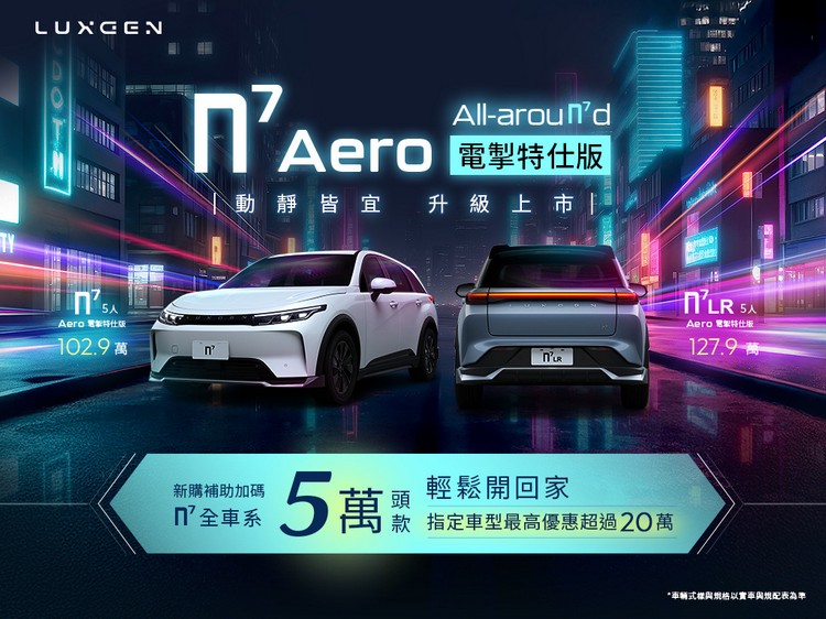 自上市以來屢創佳績、數度蟬聯台灣電動車銷售冠軍的LUXGEN n⁷,再次以嶄新姿態展現純電休旅進化可能!LUXGEN今(10/1)正式推出全新特仕車款—n⁷ Aero 電掣特仕版,在延續品牌外型設計語彙「以風塑形」的基礎上注入全新風貌,兼具霸氣風格與風馳電掣的駕馭張力。 為滿足市場對純電進化的期待,n⁷ Aero 電掣特仕版應運而生—透過升級專屬LuxAero電掣套組(前/後擾流),並搭配人氣配件 LuxAero導流尾翼、懸浮式輪圈蓋、車載充電地圖等,n⁷ Aero 電掣特仕版建議售價為102.9萬元起,入主再享4年最高20%充電點數回饋(1),不論是首次體驗純電魅力、渴望在街頭風馳電掣的新手車主,或是重視細節與個性化風格的EV進階玩家,n⁷ Aero都能滿足你對於速度、設計與實用的全方位想像,打造出動靜皆宜的全能純電休旅。