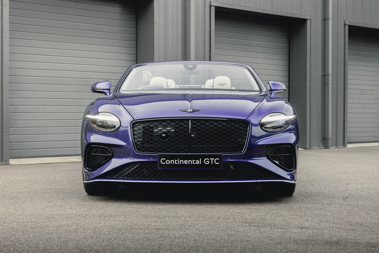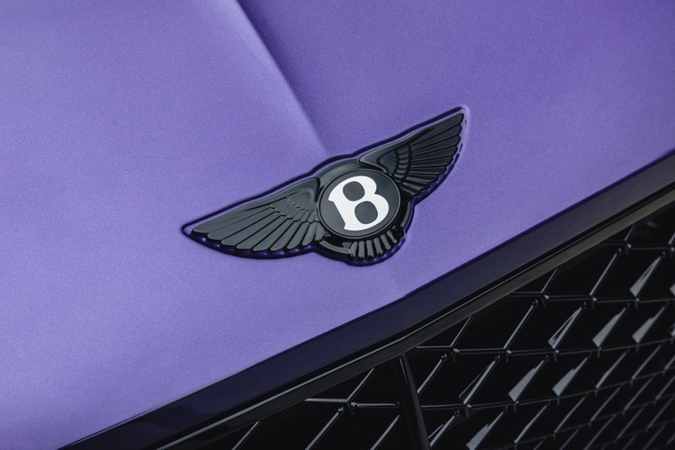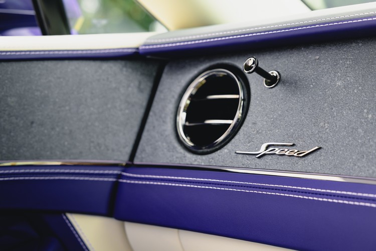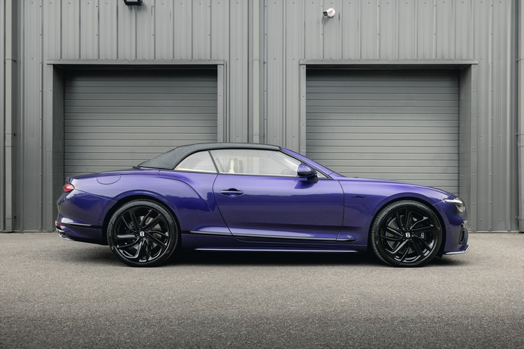 這款車色是一種鮮豔的藍紫色,讓人留下深刻印象,反映了客戶的個人期望,刻意避免了低調的色調是一個大膽的選擇。外觀採用亮面裝飾,包括亮黑色BENTLEY徽章,而七層帆布車頂則以深灰色金屬編織完成。
