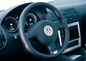 ![]() ▲R32黑色真皮與霧面鋁合金材質處理的車室空間,予人一種戰鬥氣息十足的印象。除了4MOTION外,為了配合R32的特殊產品取向,特裝車的車高較標準型的Golf降低了30mm左右的水準,搭配上18吋的巨圈與225/40ZR18的低扁平比跑胎,給予人一種超乎想像的震撼視覺印象。原廠配備四輪通風碟煞,而藍色烤漆的煞車卡鉗從輪圈的縫隙中隱隱透露出這輛車潛藏的運動潛能。