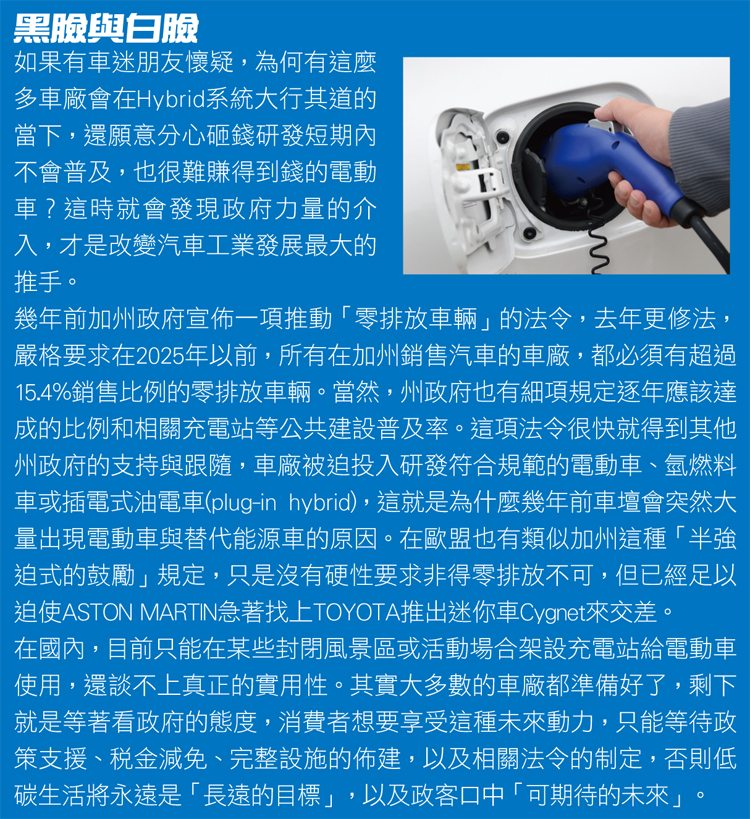 ![]() 在試駕報導之前,必須向讀者介紹關於這部車的開發背景。相信大多數的車迷都知道,TOYOTA是Hybrid混合動力車能夠普及於世的最大功臣,也是擁有最齊全Hybrid汽車陣容的汽車品牌。然而有些人可能不知道,TOYOTA研發電動車的歷史已經超過40年,第一代的RAV4 EV更從1997年就已經推出銷售,至於眼前的這款車,則是第二代的RAV4 EV。從外表很容易就能看出,它是以第三代RAV4為基礎所研發而成,控制介面和兩年前我們試乘的原型車也稍有不同,不過設計團隊還是盡量保留了原車的格局,不讓實用性被犧牲,因此無論空間與機能表現都與汽油車相同。