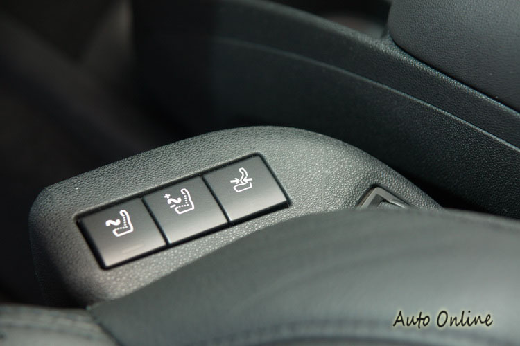 車內座椅在中規車型上是配備黑色皮革材質,頂規車型則是配香檳金搭黑色的NAPPA皮質座椅。座椅除了椅背與椅墊兩側有做包覆造型外,頭枕也同樣有側面包覆,打瞌睡時特別好用。中規以上車型雙前座椅還具有按摩與電熱(冷氣通風似乎台灣更需要)功能。副手座上下前後位置雖然沒有電動調整功能,但提供了電動調整的腿靠,乘坐的舒適度頓時倍增。