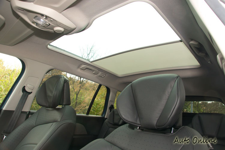 ▲大面積玻璃車頂的遮陽簾提供電動分段調整