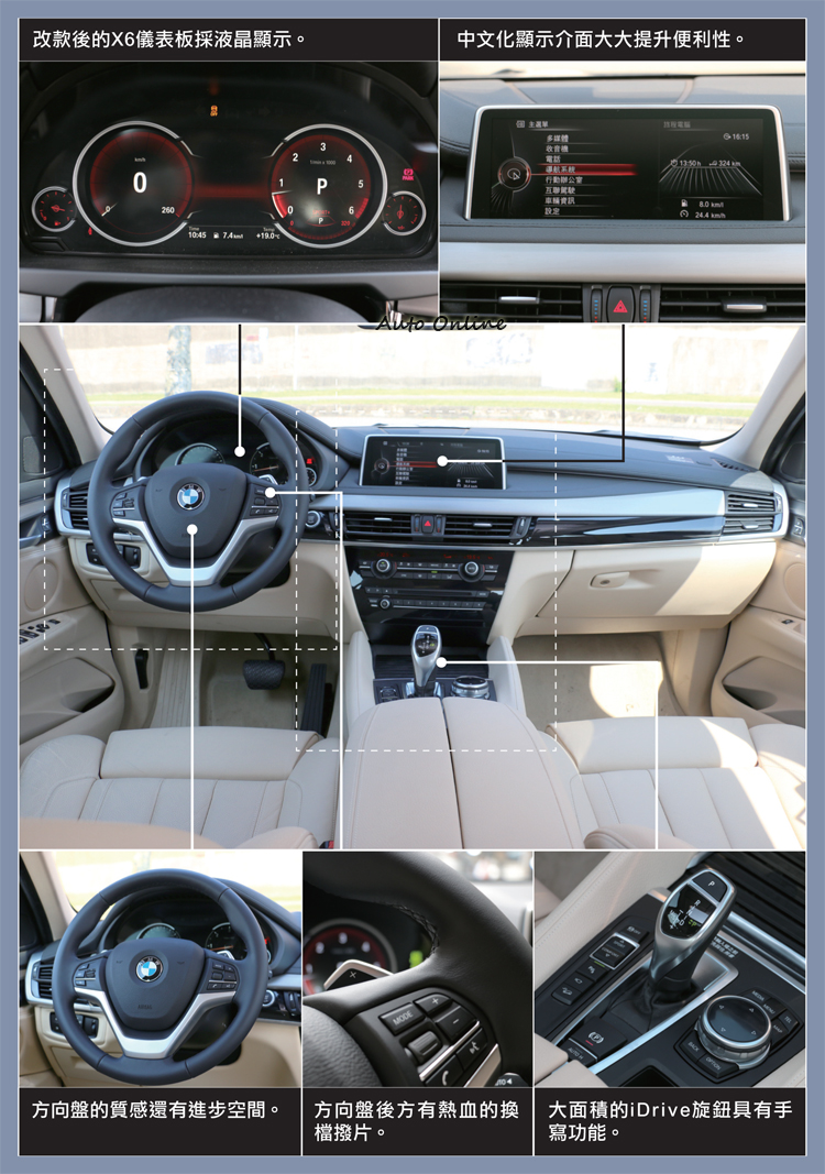 後座乘坐表現比起上一代X6明顯進步,移除後座中間固定置物空間,第二代X6貨真價實可乘載五位成人,但礙於車頂線條,後座頭部空間還是有些拘謹,給人一點點壓迫感。前座最大變動在第二代X6導入全新家族化中控台造型,與X5極為類似,也可說每款BMW都大同小異,如果把看得到的BMW廠徽移除,相信還是能一眼就能辨別這是BMW,不知道這是優點,還是BMW設計師有點懶惰。