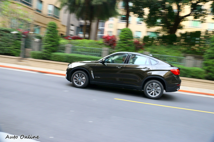 大型SUV主戰場並非山路,但以試車討生活的編輯們,當然什麼車都要試試彎道中的操控性,定位Sport Activity Coupé的X6更是不能放過。X6整體懸吊設定偏向硬朗,避震器行程剛好介於SUV與Sedan之間,所以在過彎時的側傾也剛好介於兩者之間,比起SUV有更高的過彎極限,甚至超越中大型房車靈活度。試駕車款有選配主動式轉向系統,透過伺服馬達協助駕駛轉向角度,達到更精準、更便利的行車轉向回饋,龐大的X6車頭指向性超過同級車水平。xDrive四輪驅動系統是X6殺灣功臣,四輪驅動系統不僅能應付輕度越野,在山路上,電腦自動偵測調整動力分配,維持四輪都有最好抓地力,也能藉由輸出、制動輔助車頭轉向,幾乎不需要多加思考就能開得飛快,或許達不到跑車的境界,以休旅車來論表現非常出色。