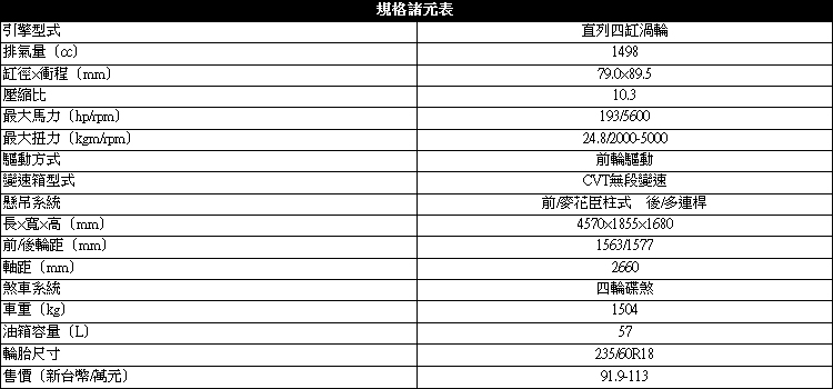 就數據上來看這顆1.5T相當於過去搭載的2.4L動力水準,但畢竟是小排氣量渦輪+CVT的組合,在動力輸出的特性上自然會有些差異。比較明顯的差異是在起步、低速時油門反應會慢個一拍,加速力也較溫和,若碰到上坡則更為明顯,但卻不會顯得掙扎,因為一但油門深些引擎轉速拉高,過兩千轉後渦輪得以發揮,加速力道就可以線性的漸增上去。