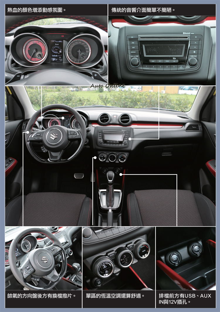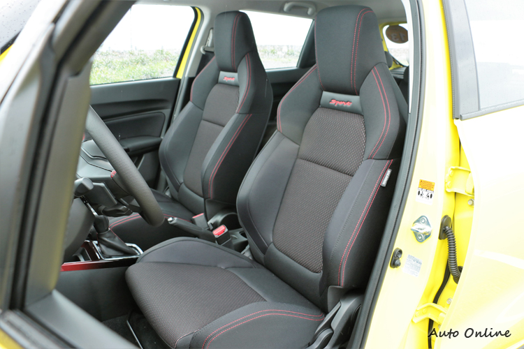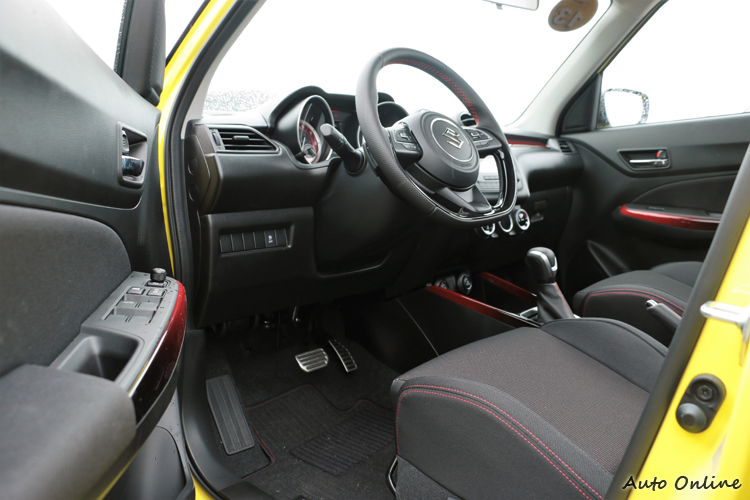車內樣貌與一般Swift相同,不過為了要做出區隔,用了很多紅色的色彩基調,像是中控台、車門把手、中央鞍座以及儀表板,不同車色下依舊維持紅色飾板;