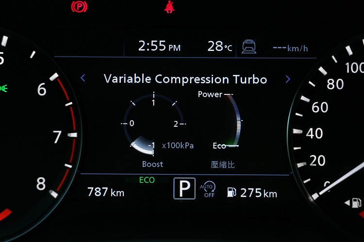 實際上路測試最想知道當可變機構運作時,駕駛會有什麼感受,經過我不斷的反覆測試,並細心的感受引擎運轉震動,頓時讓我驚訝!因為當引擎壓縮比在改變時,駕駛者或者乘坐者是毫無感覺,只能從前方儀表板看到電腦修正壓縮比的圖表,收油滑行會提升到14:1,而開始踩下油門或全力衝刺,壓縮比則降到8:1,同時間渦輪增壓衝至1.5bar,隨之而來是加速微微貼背感。