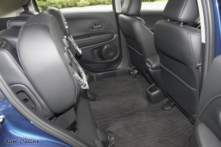 空間表現佳且富運用彈性![]() HR-V在空間方面表現就相當不錯。193公分的車室空間長度讓前後座都有寬裕的腿部空間,且後座地板中央僅有微微突起對於乘客在車內的活動比較不會造成干擾。頭部空間或許有人會因為外型上低扁的車頂線條而有所疑慮,不過實際乘坐之下即使是後座也比一般房車更要寬裕一些。由於座椅著座位置較一般房車高,駕駛者的前方視野高度比較接近SUV,上下車姿勢也比較自然輕鬆。 ![]() ▲前座乘坐空間充裕,側墊包覆性略弱些。![]() ▲後座腿部空間優異,頭部空間也沒因造型而被犧牲。由於全車系配備電子式駐車煞車,前座中央鞍部也能有更多的收納空間。排檔座後方的雙置杯座設計上頗有巧思,裡面的擋片除了具有包覆固定大尺寸飲料杯瓶,避免翻倒外,還可翻折成為墊高的底部,放置小尺寸杯瓶時取用上就更方便,是很實用的機能。置杯座後方有個不算大的置物空間,形狀方正且夠深,加上上揚式鞍座前方的置物盒與鞍座下方的鏤空形成的隱藏置物區,可以提供手機或其他小物的收納與充電。 ![]() ▲高實用性行李空間翻倒後座可直接放入兩部越野自行車。![]() ▲後座椅墊可以上掀,可放不適合倒放的長物品。