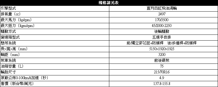 ▲動力維持搭載2.5升柴油渦輪引擎。