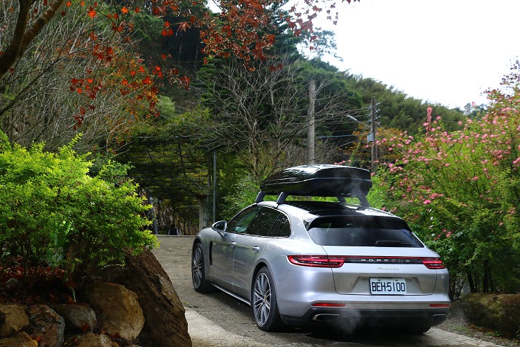 要開Panamera Sport Turismo 4 E-Hybrid去露營最令我擔心的就是後行李廂空間,畢竟全家三人露營的裝備說多也不多、說少也不少,尤其時客廳帳這類較大型的物品,沒有一定的空間表現,是很難放置於車內。好在原廠特別為試駕車款加選了兩個鋁製的橫桿與520公升車頂置物箱,一解我心中隱憂。還有車頂置物箱採兩邊雙開、長度有2180mm,像是客廳帳這類較長的物品得以放入,出發前上裝備顯得格外輕鬆。這兩項選購配備分別為橫桿17,549元與33,483元,Porsche原廠官網上都能查得到。