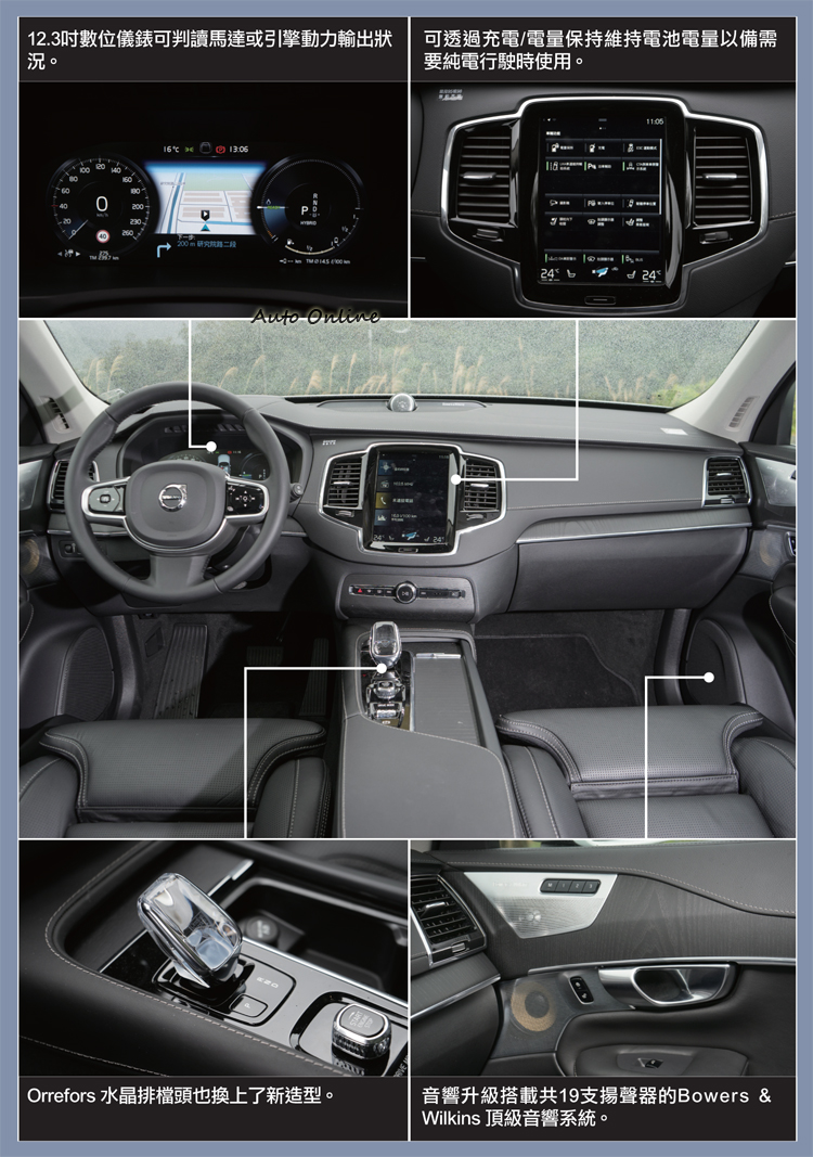 另外,在舒適性配備上,Inscription車型的音響系統升級改配功率輸出達1400瓦,含重低音在內共19支揚聲器的Bowers & Wilkins 頂級音響系統,給人更好的聆聽享受。在T8車型上,所配備的Orrefors 水晶排檔頭設計也與之前不同,兼具美感與更好的握感。