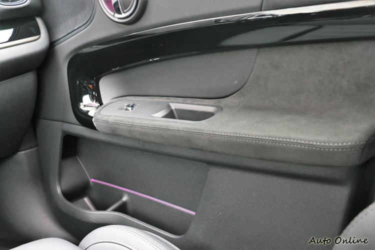 ▲門飾板為麂皮材質點綴,下方還有可變色的車內氛圍燈。