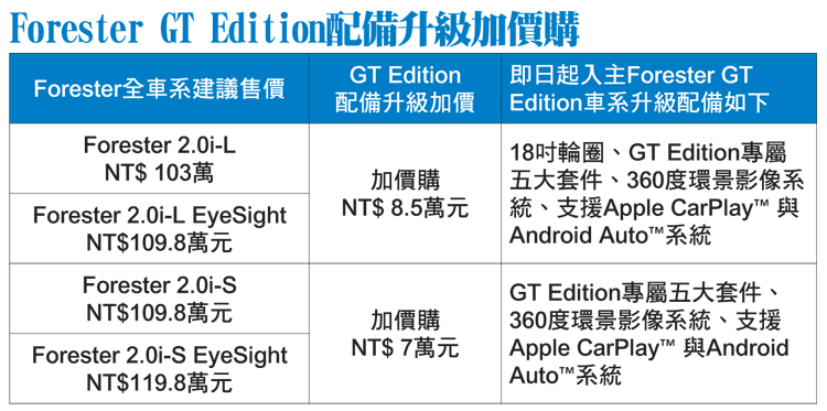 全新Forester GT Edition可搭載於Forester全車型之上,也就是你所買的任何一種等級都可加價升級為GT Edition版本,不過會依等級不同有價格上的差異。Forester 2.0i-L GT Edition配備升級加購價8.5萬元,套件包含18吋輪圈、GT Edition專屬五大套件、360度環景影像系統、支援Apple CarPlay™ 與Android Auto™系統。Forester 2.0i-S GT Edition配備升級加購價7萬元,套件包含GT Edition專屬五大套件、360度環景影像系統、支援Apple CarPlay與Android Auto統。