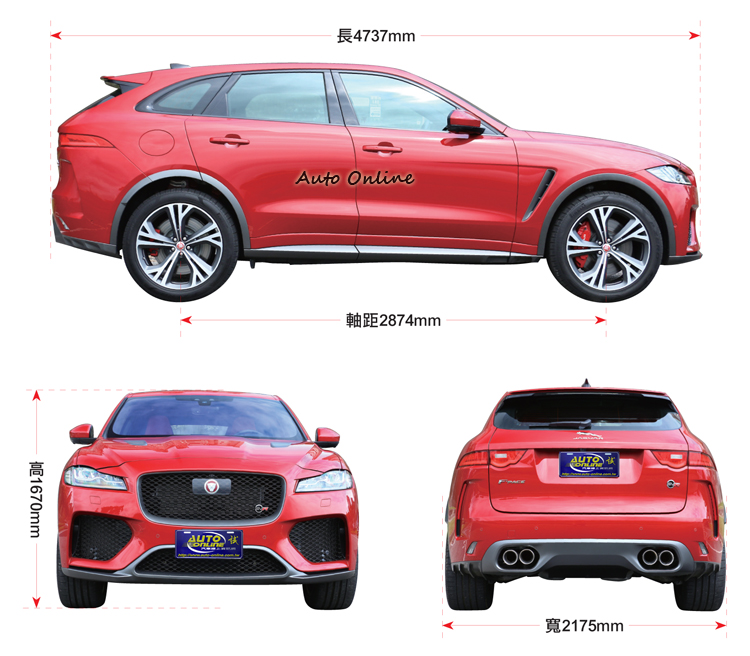 Jaguar F-Pace從2016年導入台灣至今,在車系編成上作了小小變動,目前所販售車型有25T R-Sport AWD、30T R-Sport AWD與SVR三種,其中25T與30T都是搭載一具四缸2.0升渦輪增壓引擎,同樣引擎藉由調校不同帶來輸出的差異。最後一款則是最強悍的SVR版本,搭載V型八缸5.0升機械增壓引擎,爆發出550匹的最大馬力,造就這重達兩噸的巨獸在4.3秒就能完成百公里衝刺,建議售價為台幣465萬元。