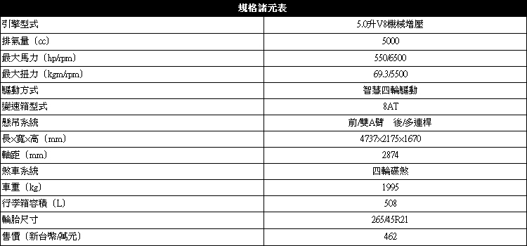 動力是一顆目前少見的V型八缸5.0升機械增壓引擎,大排量加上V8配置有著深不可測的潛力,發動引擎瞬間能感受到特有聲浪,市面上已經很少有這樣的配置。這顆引擎最大可創造出最大馬力550ps/6500rpm以及最大扭力69.3kgm/5500rpm,搭配八速的手自排變速箱加速力道源源不絕。它的輸出很線性,沒有渦輪車突然來的猛爆加速,從低轉一路攀升到高轉表現都很優雅。重量高達1995公斤的巨獸,在大排量與機械增壓加持下,4.3秒就能完成100公里/小時的加速,極速甚至高達283公里/小時。