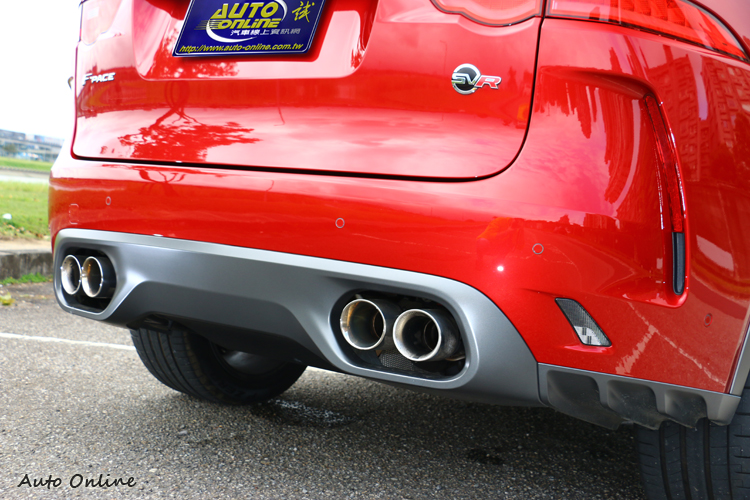 輪胎配置為265/45R21尺寸,因應四輪驅動系統,所以沒有使用前後配輪胎尺寸;鋁圈內有專屬性能版多活塞紅色卡鉗,精準又迅速的帶來絕佳制動性。車尾的主輪廓與一般車型相同,SVR版本特別增加了後保桿左右兩邊的導流孔,下方還有類似Diffuser的鰭片,提高視覺帥氣也助於高速時的穩定。