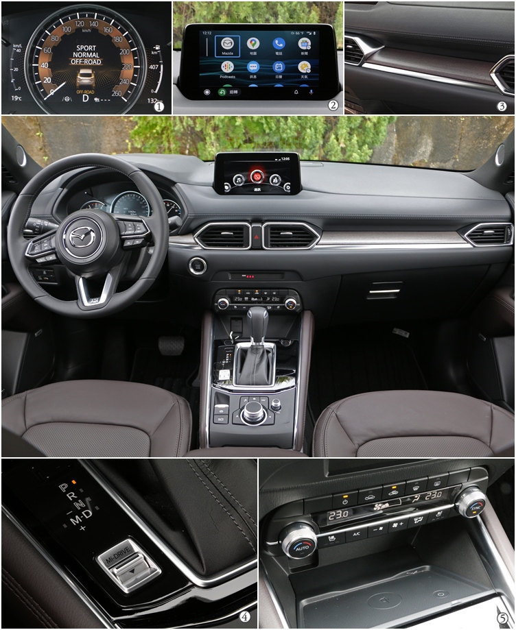 ![]() ▲(1)配備i-ACTIV AWD的車款,所提供的Off-Road循跡輔助功能對應更高的速度範圍。(2)Apple CarPlay支援無線連結,至於Android Auto則仍需USB連接線。(3)高階Signature車型配置的實木飾板,讓車室多了幾分家居的溫度。(4)透過Mi-DRIVE切換不同的駕駛模式時,儀錶上也會有對應的動畫展演。(5)無線充電座同樣是新增的配備,提供現代人行動裝置隨時備電的需求。![]() ▲專屬後座的充電插座以及杯座及置物設計,都是家用休旅車必要的車室機能。