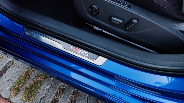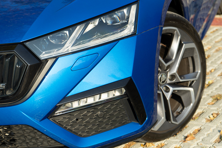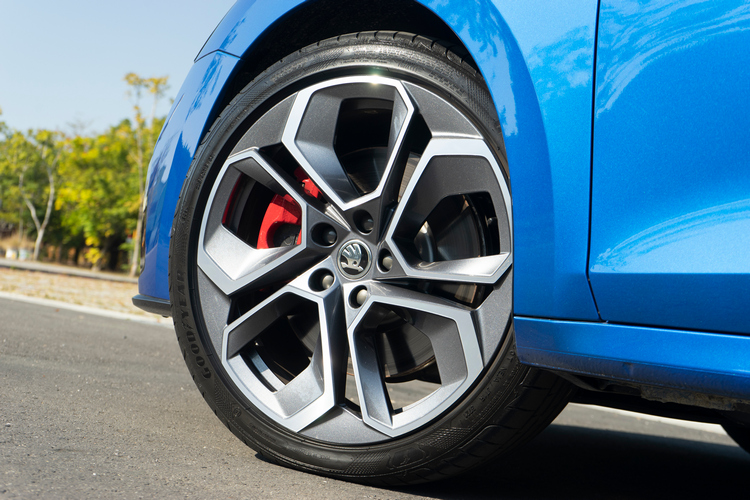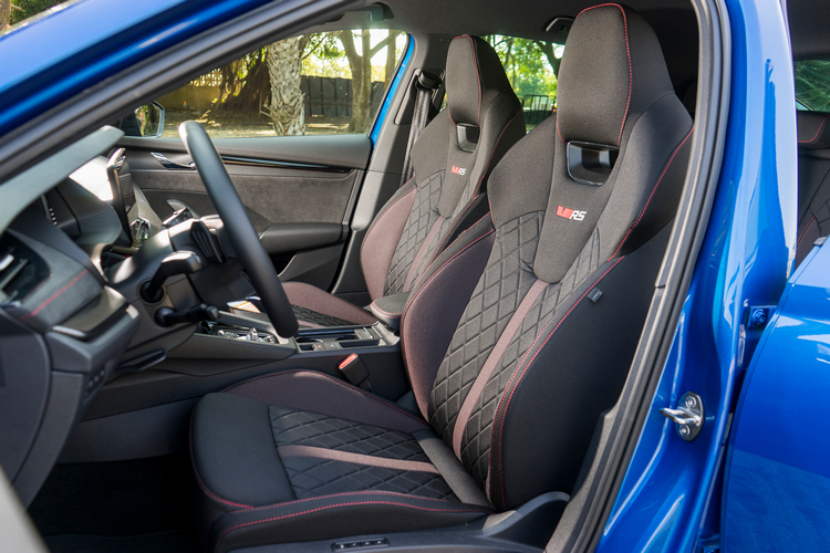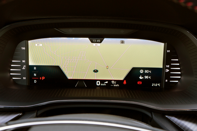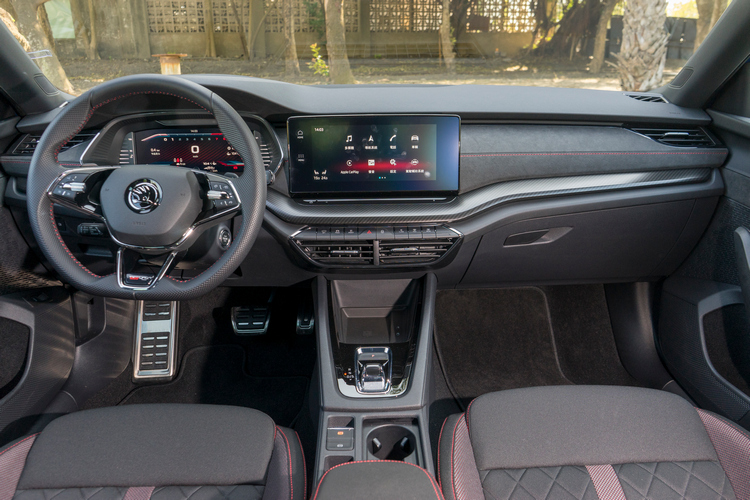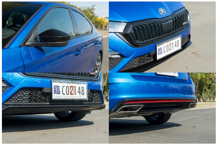 外觀上,與標準車型的細節差異包括了黑色外框的水箱罩、專屬設計的下進氣壩、前下擾流、進氣口與LED霧燈。車側可以看到19吋ALTAIR輪圈內的紅色煞車卡鉗暗示在煞車性能上的提升;後視鏡殼與窗框也採用黑色處理。車尾部分,行李廂蓋上多了一道比一般鴨尾翼更立體的黑色尾翼。下方則有RS專屬左右側單出的跑車式排氣尾管、後下擾流與兩側加入後保桿導流翼。車身上的「SKODA」、「Octavia」與「RS」也都一併「黑」掉,看來「黑化=運動化」的潮流思維也同樣發生在SKODA之上。