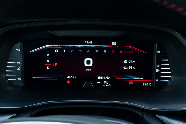 方向盤前方的10.25吋數位儀錶顯示幕除了原本的四種畫面模式外,在RS車型上還多出了以平面方式顯示轉速的「運動」畫面模式,雖然在熱血感上還沒有十分濃厚但也算是有些氣氛了。同樣地,在10吋直立式中控螢幕上也會在起動時展示專屬的歡迎Logo與動畫。