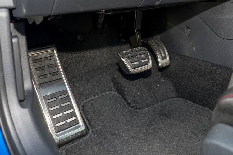 車身較大、車重也比Golf GTI重了約70公斤,Octavia RS有著與Golf GTI相當接近的動力性能實力,油門反應不錯,夠迅速但也不會過於敏感,轉速過1600-1700rpm後扭力明確湧現帶來豐沛而流暢的加速感,搭配七速DSG自手排系統之下動力的銜接也挺順暢,減速後的再加速沒有麼明顯的落拍。不過值得一提的是,車上提供三種駕駛模式:節能、一般、運動(+個人化)。即使是在一般與運動模式間,在加速反應與煞車制動感上都有不小幅度的差異,在行路性上劃出一定區隔。